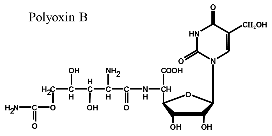 •多抗霉素为肽嘧啶核苷酸类抗菌素,它是可可链霉菌所产生的代谢产物,有从A到N 14种不同的同系物组成,其中多抗霉素B是其最具有杀菌效能的成分;